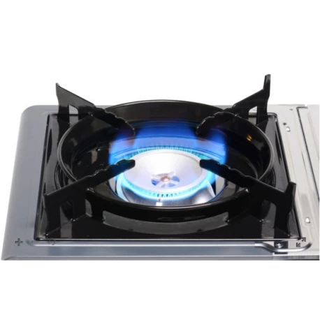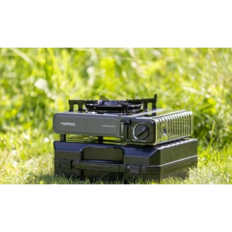 Fornello Campingaz Camp Bistrò 3 modello rivisitato, caratterizzato da due sistemi di sicurezza integrati e un supporto per pentola modificato in grado di garantire stabilità e un uso più sicuro durante la cottura. Il trasporto è reso ancora più facile e comodo grazie alla custodia rigida in plastica fornita in dotazione.