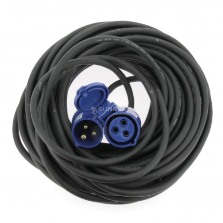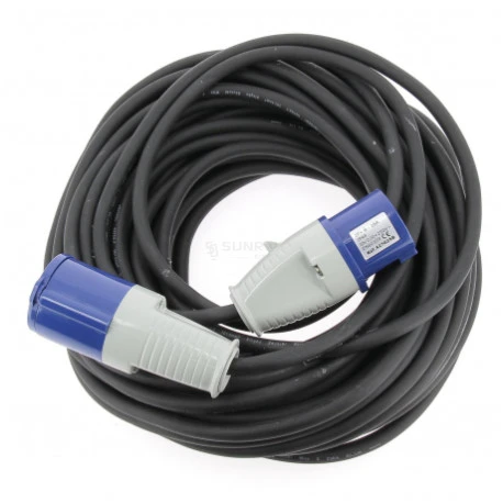 Cavo di prolunga con spine maschio e femmina conformi agli standard CEE 17 per il collegamento ai terminali del campeggio.