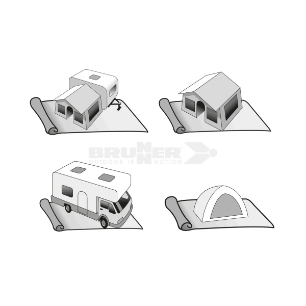 Stuoia Brunner Kinetic 250×400 per verande dalla grammatura di 400g/m, utilizzabile su entrambi i lati. Particolarmente indicato per caravan e camper come copertura dal terreno. Dotata di borsa con manici per il trasporto