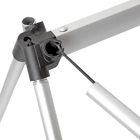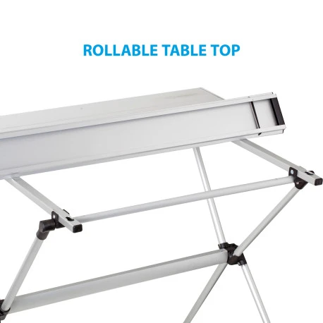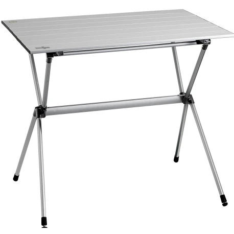 Tavolo da esterno pieghevole con struttura in alluminio ultraleggero e ripiano arrotolabile. Costruzione completamente priva di materiali sintetici, senza snodi o connettori in plastica. Tutti i tubi che compongono il telaio sono dotati di elastici di solidarizzazione per evitare la perdita di singole parti. Il montaggio è rapido, molto semplice e non sono neccesari atrezzi. Ottime dimensioni di imballaggio per un facile stoccaggio.