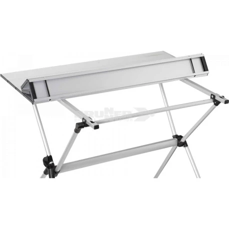 Tavolo da esterno pieghevole con struttura in alluminio ultraleggero e ripiano arrotolabile. Costruzione completamente priva di materiali sintetici, senza snodi o connettori in plastica.