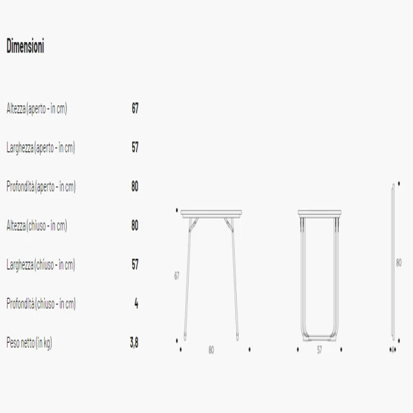 – Dimensioni chiuso: 57 x 4 x H80 cm